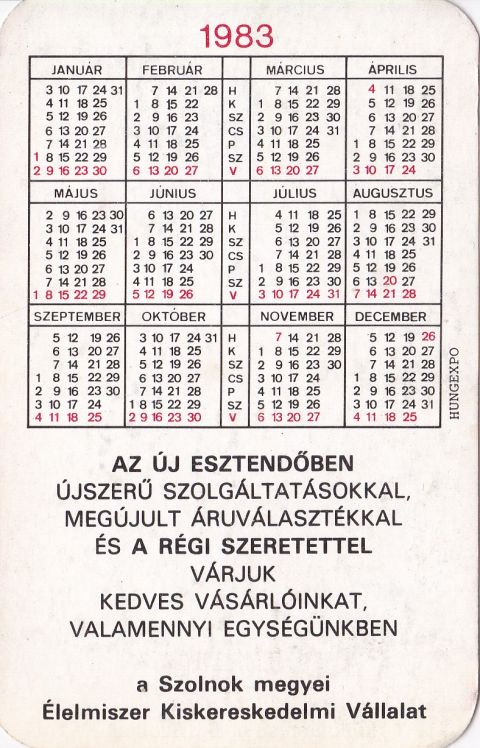 Mindezt csak azért mesélem el újra, mert a napokban vettem egy 1983-as kártyanaptárt, amit annak idején a Hungexpo gondozásában a Szolnok megyei Élelmiszer Kiskereskedelmi Vállalat jelentetett meg. Valószínűleg elég nagy példányszámban, hiszen akkor még komoly reklámértékkel bírtak ezek a kisnyomtatványok. Amin például azt is a leendő vásárlók tudomására lehetett hozni, hogy „az új esztendőben újszerű szolgáltatásokkal, megújult áruválasztékkal és a régi szeretettel” várják őket a cég valamennyi egységében. Ami akkoriban olyan boltokból állt, mint a Széchenyin nem sokkal korábban nyílt Aranykanna, a ma már drogériaként működő Sarok ABC a piaccal szemben, vagy éppen a kártyanaptár alsó fotóján látható Márka, a Jubileum téren.