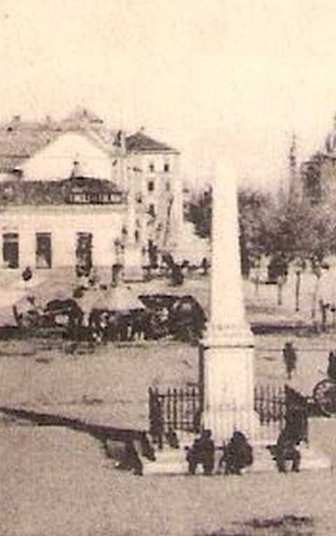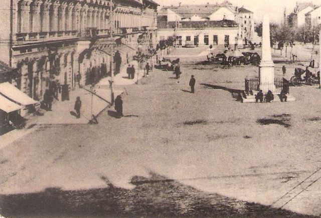 Többek között emiatt is gondolom, hogy egy hétköznap délután készülhetett a fotó. A délutánra pedig az árnyékokból következtetek, hiszen ahhoz, hogy a Steiner és Fia féle ház árnyékát is lássuk, sőt a 68-as obeliszk lényegében napóraként működve a tér északkeleti sarka felé vessen árnyékot, valamikor 4-5 óra körül dolgozhatott a fényképész. Hogy nem később, azt az emberek ruházatából gondolom. Ami annak ellenére többrétegű, hogy a Városházával szemben lévő fák egész nyárias koronát mutatnak. De erre a viszonylag koradélutáni időpontra következtethetünk a Városháza felénk közelebb eső sarkánál folyó útkarbantartási munkálatról is. Vajon mi történhetett a macskaköves főutcával? Érdekes amúgy, hogy több olyan képeslap is ismert, amelyeken útkarbantartók vagy éppen köztisztasági dolgozók tűnnek fel.