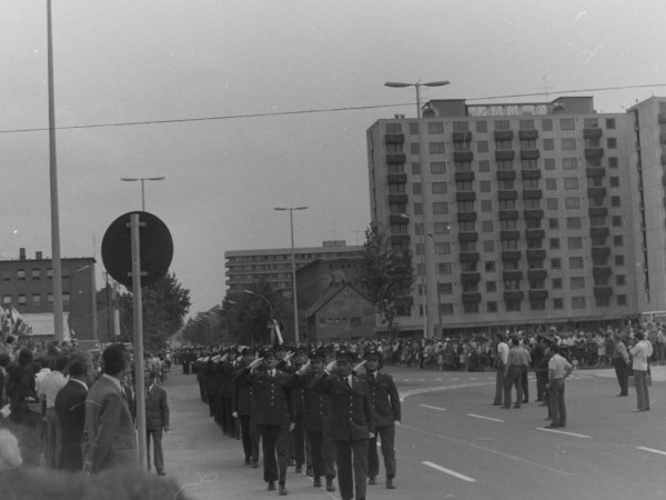 A tér kialakulása és félkészsége szempontjából kicsit több információval bír a második kép, ami már az avatásra felsorakozott, arccal a későbbi Szolnok ABC felé néző tisztjelölteket mutatja. Mögöttük meglehetősen durván lefóliázva Gyurcsek Ferenc Tanúhegy című alkotását látjuk, amit majd csak szűk másfél hónappal később avat fel Losonczi Pál, az elnöki tanács elnöke, kvázi államfő. Azt hiszem, joggal feltételezhetjük, hogy az emlékműtől jobbra, a háttérben álló darut még az elnök elvtárs is láthatta, hiszen a teret dél felől szegélyező tízemeletesek biztosan nem készültek el augusztus 20-ára. Sőt, szerintem az építési területet takaró paraván is sokáig a helyén maradt még, merthogy a tízemeletesek előterében lévő szolgáltató épületek csak 1977-1978 körül lettek teljesen készen. Miként a vasutas művelődési ház sem készült el 1975-re, miközben 1973-ban még ezt ígérték a vasutasok szakszervezetének, ami amúgy nem kevés pénzt adott nemcsak az intézményre, de a Tanúhegyre is.