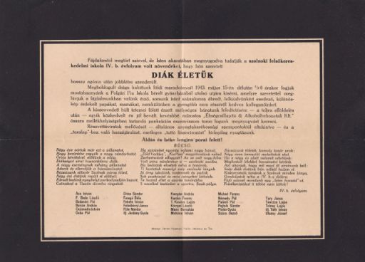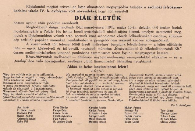 Ha valaki azt gondolná, hogy a mai középiskolások dédszülei – a modern technikai eszközöktől eltekintve – mások, netán jobbak vagy rosszabbak lettek volna tizenhét-tizennyolc évesen, mint a mai diákok, akkor annak had ajánljam figyelmébe ezt az 1943-as kiadású „gyászjelentést”. Ami egyébként arra is remekül rávilágít, hogy a negyvenes évek sem volt konzervatívabb vagy prűdebb, mint napjaink. Megkockáztatom: talán ma nem is lenne olyan iskolaigazgató, aki egy ilyen nyomtatvány kiadásához hozzájárulna. Ehhez a lassan hetvenöt éves kisnyomtatványhoz ugyanis biztosan kellett az igazgató engedélye, hiszen hivatalos nyomdában, háborús időkben készítették.