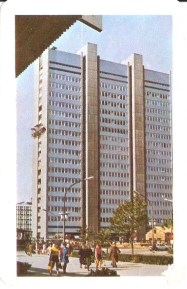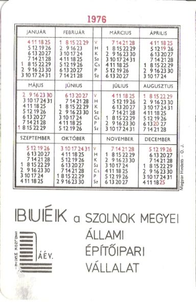 Van még egy naptár, amelyiken ugyan feliratban nem jelenik meg a 900 éves évfordulóra való utalás, de a képes oldala miatt feltétlenül ide sorolnám. Ez a Szolnok Megyei Állami Építőipari Vállalat 1976-os naptára, aminek képes oldalán a cég akkoriban új sikere és büszkesége látható. Az 1975. november 7-én átadott 17 emeletes Vízügyi Székház. Igaz, ha jobban megnézzük, maga a felhasznált kép legalább három hónappal az átadás előtt, valamikor 75 nyarán készülhetett, hiszen a parkolóban még ott a felvonulási épület, a tízedik emeletnél pedig egy külső, függő állvány. De ahhoz, hogy a legnagyobb szezonban, akár az épület avatására elkészülhessen egy következő évi zsebnaptár, nem várhattak jobb fotóra a nyomdában.