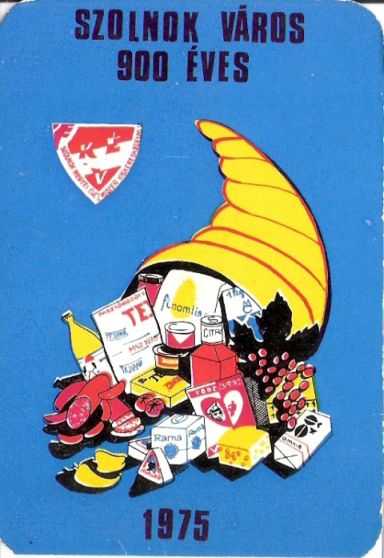 Ugyanebben az évben jelent meg a Szolnok Megyei Élelmiszer Kiskereskedelmi Vállalat (későbbi ÉKV) naptára is, amelyik szintén a város 900 éves ünnepét tette a címoldalára. Igaz, az ünnepi naptárat egy bőségszaruval is kiegészítették, ami utalhat akár a fejlődő szocialista nagyvárosban találhat ?bőségre?, de akár a cég áldásos tevékenységére is. Mindenesetre érdemes a grafikán is kicsit elidőzni. Az akkor prémium minőségnek számító Omnia kávé, a Podravka levespor, a Rama margarin, és a Mackó sajt sziluettje egyértelműen felismerhető, de a szaru szájában a Mátra Cukor logója is felsejlik. A naptár hátulján pedig nemcsak praktikus újévi üdvözletet – „Egész évben jó vásárlást kíván az ÉKV Vevőszolgálata” – találunk, hanem megtudhatjuk azt is, hogy a cégnek Szolnokon, Jászberényben, Törökszentmiklóson és Martfűn voltak üzletei.