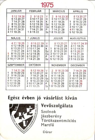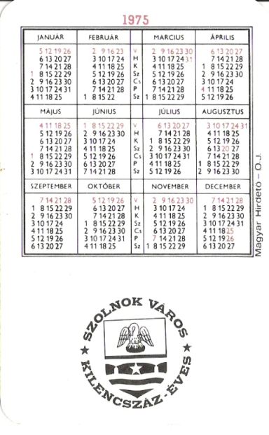 Ha valaki azt gondolja, hogy a naptár hátsó, nem képes oldalán több információt találunk a reklámeszközt megrendelő cégről, az téved. A naptár rész alá ugyanis csak a ?Szolnok város kilencszáz éves? körfeliratú, városi címert helyezték el. Hogy maga a cég hol székelt, miként érhető el, az sajnos nem derül ki. Pedig, ha jól gondolom, 1975 ebből a szempontból a Kunság Füszért életében is jelentős esztendő volt, hiszen ekkoriban foglalhatta el új irodaházát. Mégpedig a Nemzeti Szállóban, miután annak kiváltására, a város 900 éves jubileumának tiszteletére átadták a Pelikán szállót.