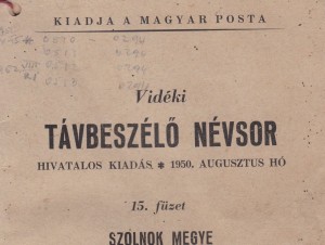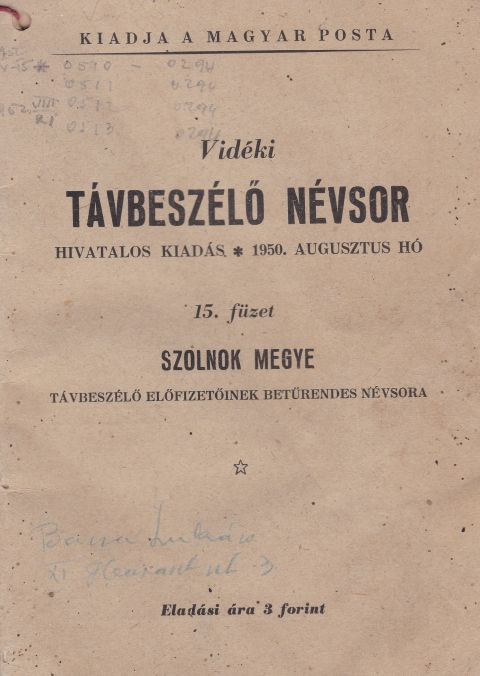 A hatalmas kisnyomtatvány-gyűjteménnyel (is) rendelkező Bauer Istvántól kaptam kölcsön az 1950-ben kiadott Vidéki Távbeszélő Névsor 15. füzetét, amely Szolnok megye telefon előfizetőit sorolja fel. A korabeli telefonellátottságot talán jól szemlélteti, hogy a borítóval együtt mindössze harminchat A5-ös oldalból álló füzetecskében a szolnoki telefonszámok felsorolása elfér tíz oldalon. Az akkoriban viszonylag drága, három forintba kerülő, a Magyar Posta által kiadott, a debreceni Alföldi Nyomdában előállított kiadvány szolnoki telefonszámai – és a hozzájuk tartozó nevek és apróbb kiegészítések – számtalan érdekességet, sőt számomra ma még megmagyarázhatatlan bejegyzést is tartalmaznak.