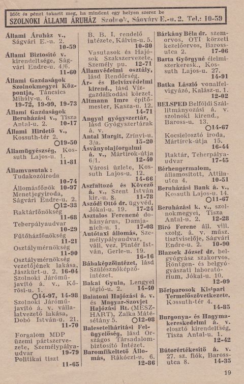 Ugyanakkor a mából nézve vannak az államosításra vonatkozó – számomra – nagyon megrázó „utalások” is ebben a telefonkönyvben. Például miközben Faragó Sándor államosított nyomdája a Kossuth utca 21-ben működött, a legendás papírkereskedő maszek könyvkötészete és papírfeldolgozó üzeme a Pacsirta utcában még megvolt. Kevésbé voltak „szerencsések” a Rákos testvérek, akiknek államosított – ez így szerepel a telefonkönyvben – vattaüzeme a Vöröshadsereg útján, a Szőnyi testvérek államosított ecetgyártó telepe pedig a Zrínyi utcában folytatta tevékenységét. Ugyanakkor ennek az egész rablásnak a telefonkönyvben visszaköszönő „csúcsa” a szolnoki gyógyszertárak felsorolása. Ezek mindegyike szerepel az eredeti neve szerint is a sorban – például az Angyal gyógyszertár egészen elől -, ám azzal a megjegyzéssel, hogy címük és telefonszámuk már a Gyógyszertárak Állami Vállalatnál található. Ahol azonban nemcsak a gyógyszertárak régi – gondolom akkoriban közismert – nevei (pl. Damjanich, Megváltó, Szent István) szerepelnek a telefonszámok előtt, hanem zárójelben azoknak a működtető gyógyszerészeknek a nevei is, akiktől ezeket az üzleteket elvették.