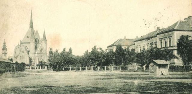 A mellékelt két kép készítése között körülbelül húsz év telhetett el. Az első felvétel biztosan a két világháború között készült, amikor nagyjából a mai „meztelen szobor” helyén még egy szökőkút állt. A tér is jóval kisebb volt, mert mint a felvétel bal oldalán látható, a mai kerengő területére még belógott a csendőrség – később tűzoltóság, majd iskola – épülete.