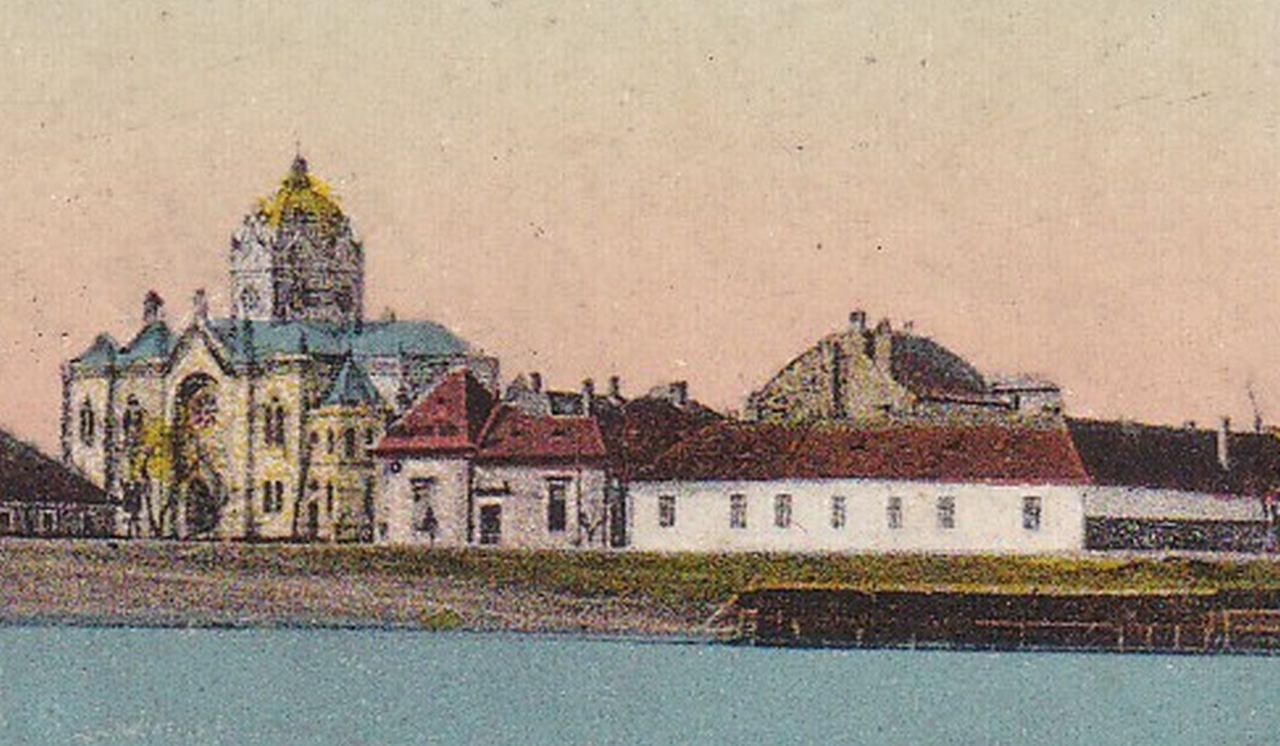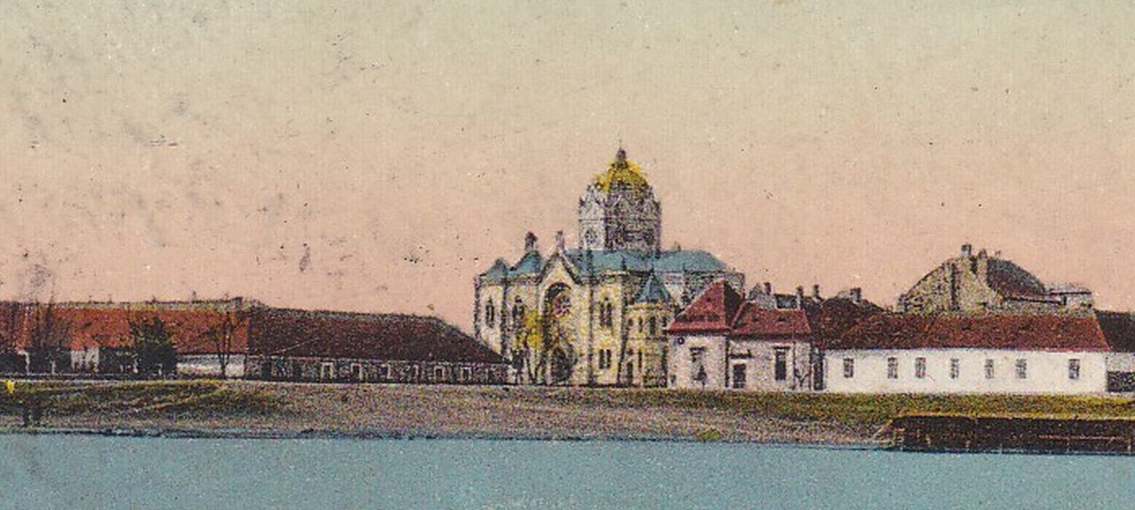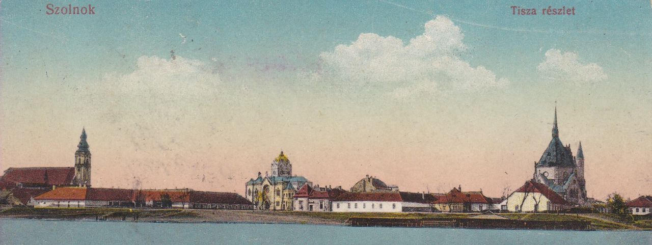 Hogy a fővárosi „Vasúti levelezőlapárusítás” gondozásában megjelent képeslaphoz használt felvétel csak 1905 után készülhetett azt a Barta-palota tűzfala bizonyítja. Ami ott látható a zsinagógától jobbra, a földszintes épületek mögött. Ugye ez az a gyönyörű, tornyos bérház, amelyik ma a Sóház út és a Tiszai hajósok tere sarkán áll, földszintjén étteremmel, emeletén nyelviskolával, múltjában az Államvédelmi Hatósággal. Azt pedig, hogy a fotósnak 1912 előtt kellett dolgoznia, egy hiányzó épület igazolja: a belvárosi nagytemplom és a zsinagóga között semmi nyoma az iskola épületének, amit 1913-14-ben húztak fel. Tehát talán nem túlzás azt mondani, hogy 110 évvel ezelőtt ez a kép tárulhatott mindazok elé, akik átballagtak a folyó várossal szemben partjára, és a Móricz-liget után elterülő ártári erdő széléről, vagy a Tiszán elhaladó hajóról szemlélték Szolnokot.