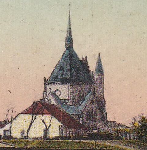 Ezt a lapot azonban nem a három templom, hanem a körülöttük álló épületek miatt citálom, merthogy a színezés ellenére azon kevés felvételek egyikét őrzi, amin ezek a mára jórészt eltűnt házak jól láthatóak. Ha a belvárosi nagytemplom tövétől indulunk, akkor a mai Tiszaparti és Pálfy helyén az államrendőrség szétterülő épületét figyelhetjük meg. Később ebben a ma már nem létező Szigony és Őr utcák által közrefogott magas tetős épületben működött a helyi tűzoltóság, aminek megfigyelője a templom tornyát használhatta a város szemmel tartására. A hatvanas években aztán iskola lett belőle, hogy végül átadja helyét a két középiskolának. Későbbi térképek és képek alapján nekem úgy tűnik, hogy a katolikus templom és a zsinagóga között nem egyetlen hatalmas épület állt, hanem több, azonos magasságú, hosszú ház képe folyik egybe.