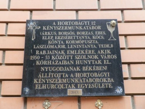 A Hetényi Géza Kórház egyik kis belső udvarán bújik meg egy 2013-ban elhelyezett fekete emléktábla. A 12 hortobágyi kényszermunkatábor valamelyikéből a szolnoki kórházba került és itt elhunyt kitelepítetteknek állít emléket. Talán nem haszontalan némi magyarázatot fűzni hozzá.