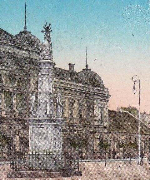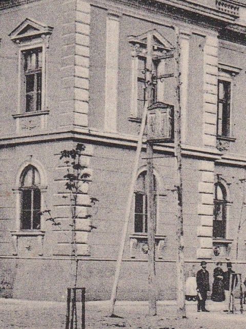 E kettőn kívül két további, de néhány évvel később megörökített, önálló oszlopon lévő közvilágítási lámpát sikerült még találnom 1910 előtti képeslapokon. Az egyik egy 1906-ban postára adott anzikszon fedezhető fel a megyeháza Lengyel légió utca felőli sarkán, és bár fölötte ott a villanyvezeték, azért kicsit bizonytalan vagyok, hogy ez valóban árammal működött-e. Ezzel szemben a Pfaff-féle vasútállomásról készült képeslapon megörökített kandeláber esetében már teljesen biztos, hogy az árammal működött az utasforgalmi épület főbejárata előtt. Sőt, nekem úgy tűnik, hogy ebben az esetben már nemcsak az oszlop felső része, de az egész fémből készült, a működéshez szükséges villamosenergiához pedig nem légkábelen, hanem a föld alatt jutott a szerkezet.