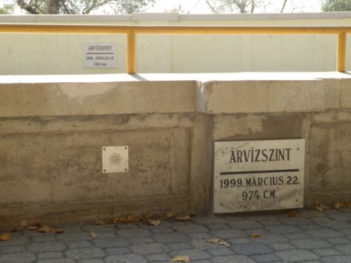 Az egymással majdnem szemben elhelyezett 1999-es és a 2000-es árvízi szinteket mutató emléktáblák egyszerűen, mégis zseniálisan mutatják, miért is volt szükség a régi sétány átépítésére, illetve, mekkora áradások ellen kellett felvenni a harcot a városnak. Hasonló táblák a belvárosi Tisza-híd Szabadság tér felőli pillérén is láthatók, ám ott nem annyira érzékletes, hogy annak idején mekkora volt a baj. Meg ugye az sem, hogy a legutóbbi, legmagasabb árvízszintet mennyivel kellett meghaladnia az új gátnak. E négy táblás emlékhelynél viszont mindez tökéletesen megjelenik, főleg, ha egy modern műalkotáshoz illően, mi magunk is annak részévé válunk.