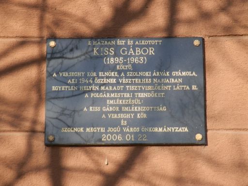 Szégyenkezve vallom be, hogy eddig alig tudtam valamit Dr. Kiss Gáborról, akinek emléktábláját utolsó lakóhelyén 2006-ban, a magyar kultúra napján helyezték el. A jellegtelen, fekete, műkő tábla – alatta még koszorúkampó sincs – csak akkor vehetően észre, ha gyalog megyünk el a Szabadság tér tornyos, sarki háza előtt, hiszen az útról nézve, az autók kerekeivel van egyvonalban. A „legszolnokibb költőnek” is nevezett Kiss Gábornak 1895 és 1963 között kalandos évek jutottak, amelyekből negyvenhármat ebben a városban töltött, nem is akárhogyan.