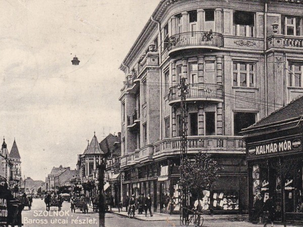 A Baross utcának ez a része egyébként Szolnok egyik fontos bevásárló utcája volt egészen a hetvenes évek elejéig. Ezen a képen még Kalmár Mór vaskereskedése működik a Csarnok utca felénk közelebb eső sarkán, helyén a második világháború után majd a Tiszavirág eszpresszó kap helyet. Magában a Madas-házban a fotózáskor vagy az azt követő években vitte divatáru üzletét Matkulicsk Mátyásné, de itt volt a Triznya cipőbolt is, sőt a Csarnok utca felőli oldalon dolgozott Tomanek Erzsébet szűcsmester is. Tovább haladva az állomás felé a Glück divatház, Kecskés József szűcsmester vagy éppen Kovács Sándor hentes üzleteibe térhettek be a korabeli vásárlók.