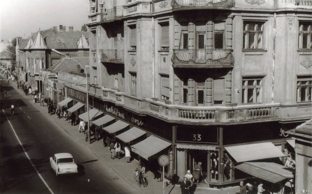 És akkor túlélhette volna a hetvenes évek közepét a Beloiannisz út 9. szám alatt lévő Rövidáru bolt is, amit ugyanúgy a helyi Iparcikk Kiskereskedelmi Vállalat működtetett, mint a szomszédos, és máig legendás 33-ast, illetve a Madas-házban lévő, de ezen a képen nem látható Hófehérke gyermekruházati üzletet. E boltok kapcsán szerintem érdemes „felfedezni” a kirakatok fölött lévő, az utca fölé kiengedhető napellenzőket, amelyek részben a kirakatok láthatóságát szolgálták, másrészt a nyári „korzózást” is segítették. Vessenek meg érte, de én ezekért elmorzsolok néhány könnycseppet! Merthogy nekem hiányoznak Szolnokról a valódi, és pláne az igényes kirakatok. Illetve szerintem kevés praktikusabb „utcabútor” szolgálhatna bennünket az egyre melegebb nyarakon, mint az ilyen utcára kiengedett napellenzők.