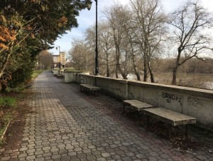 A sétány különlegessége a RepTár közelében lévő három, a mellvédbe applikált ovális virágágyás, és a közöttük lévő térbe ütemesen helyezett négy kőpad. Nem tudom, mire gondolhatott a tervező, mi lehetett ezekkel a szándék, de az biztos, hogy soha nem töltötték be a funkciójukat. Azaz gondozott virágágyás éppúgy nem volt itt, mint a padokon megpihenő sétálók. Viszont a bumfordi utcabútorok lassan, de biztosan pusztulnak, ráadásul úgy tűnik, a sétány takarítását is nehezítik, miközben a firkálók fantáziáját megmozgatják.
