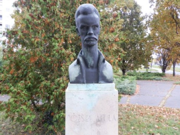 Egy gyors kvízben vajon hány szolnoki lakos tudná megmondani, hogy a három leggyakrabban megmintázott jeles magyarnak – Kossuth, Petőfi és József Attila – hol találhatóak szobrai a városban? Kossuthéról elárulom, hogy ma már nem közterületen, hanem egy középületben áll, Petőfi esetében pedig több köztéri alkotást is meg lehetne nevezni. József Attila kapcsán viszont nem csodálkoznék a rossz válaszokon, ugyanis nehéz vele „összefutni”, hiszen a Nagy Imre körút és a József Attila út kereszteződésében, lényegében egy nagyobb járdaszigeten találjuk a szobrát. Talán nem túlzás azt mondani, hogy ez az egyik legnehezebben megközelíthető, legzajosabb helyen lévő szobrunk, ami emiatt legtöbbször magányosan álldogál az egyébként szépen gondozott parkban, és immár 38 éve figyeli meredten a város forgalmát.