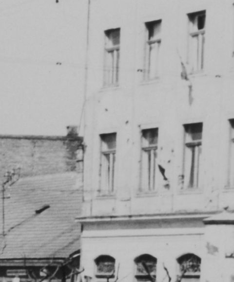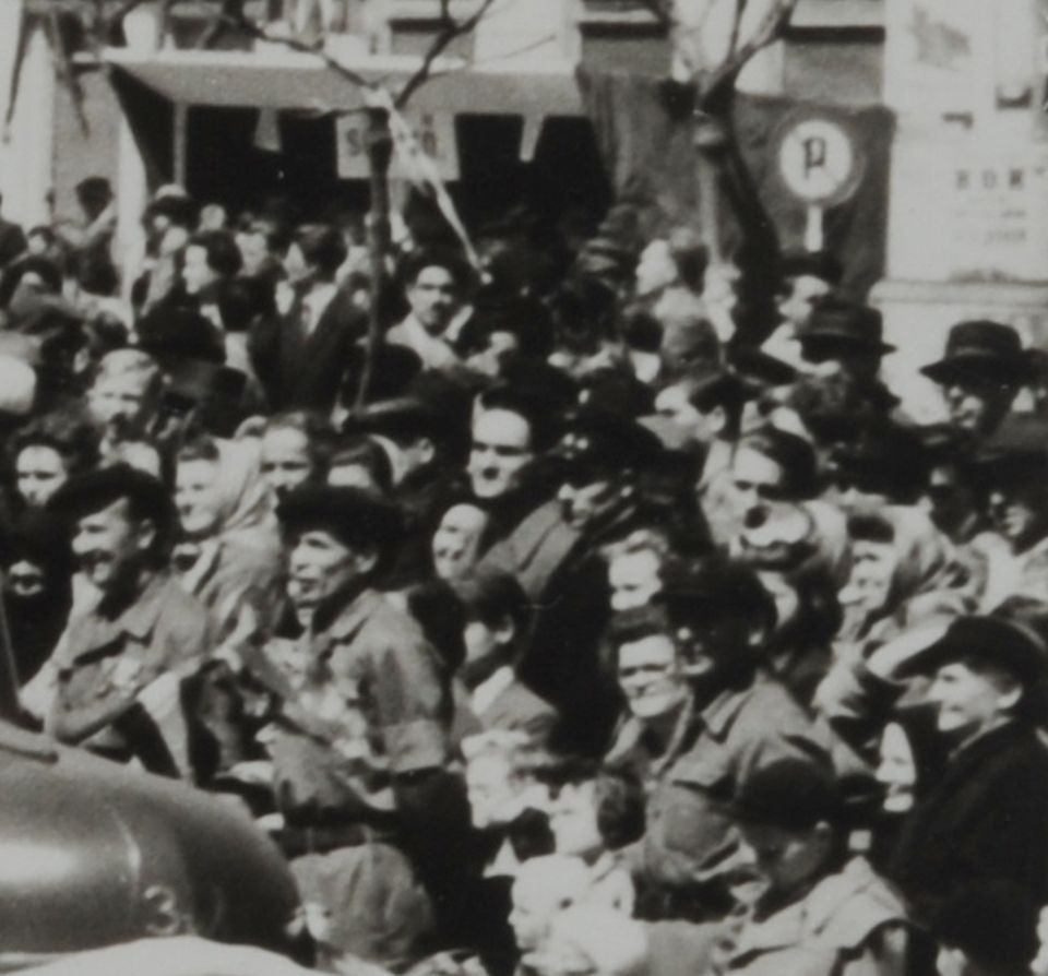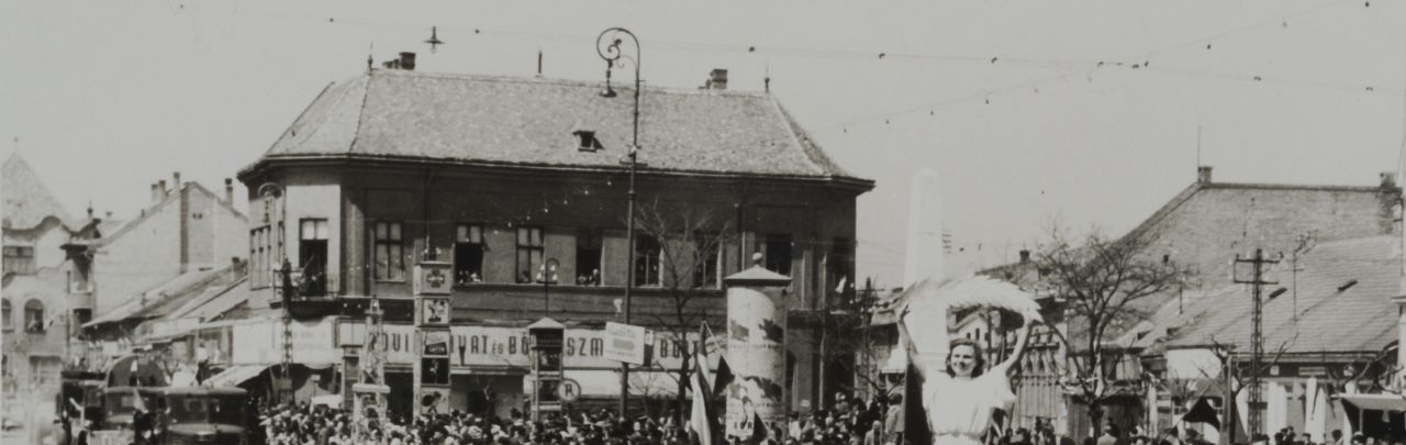 Hihetetlen 63 év távlatából, hogy ez a felvétel Szolnok főterén, minden bizonnyal a tanácsháza előtti ideiglenes tribünről készült. Ma már csak két épület áll a megörökítettek közül. A fotó datálását egy azóta épített ház, illetve a május elsejei felvonulást biztosító munkásőrök jelenléte segíti.