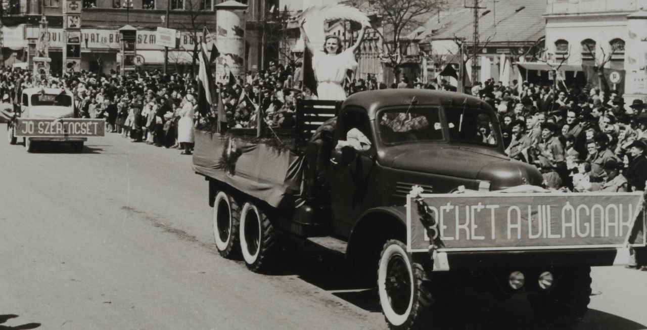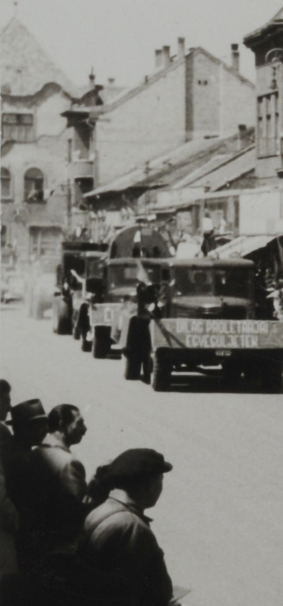A korabeli felvonulókról a házaknál sajnos sokkal kevesebbet lehet tudni. Pedig milyen érdekes lenne kideríteni, hogy az elől haladó ZIL 157-es platóján ki „alakíthatta” a pálmaágat tartó felszabadulási „emlékművet”! Mert akkor esetleg arra is fény derülne, melyik vállalathoz vagy társadalmi szervezethez tartozhatott az a háromtengelyes, gyönyörű fehérszélű gumikkal szerelt, „Békét a világnak!” felirattal díszített teherautó. A következő, a „Jó szerencsét!” táblát hordozó – szerintem – IFA Framo V901-es a platón lévő mini fúrótorony miatt egyértelműen beazonosítható: a szolnoki kőolajosok installációja lehetett. Viszont, hogy a sorban érkező további, feldíszített teherautók kihez tartozhattak, az ma már ugyanolyan, csupán személyes emlékekkel esetleg feloldható rejtély, minthogy az ünneplő tömeg fölé magasodó hirdetőoszlopokon miket reklámozhattak 1958 tavaszán, Szolnok főterén.