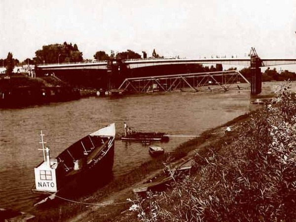Ennek ellenére, a Szolnok életében nagyon jelentős beruházás egyik utolsó pillanatát megörökítő fotón ott világít a NATO felirat. Feltételezem, hogy nem a fotó kedvéért pingálta valaki a hajóra, sőt az sem kizárt, hogy ez a hajó hónapokon keresztül így segítette a hídépítők munkáját.