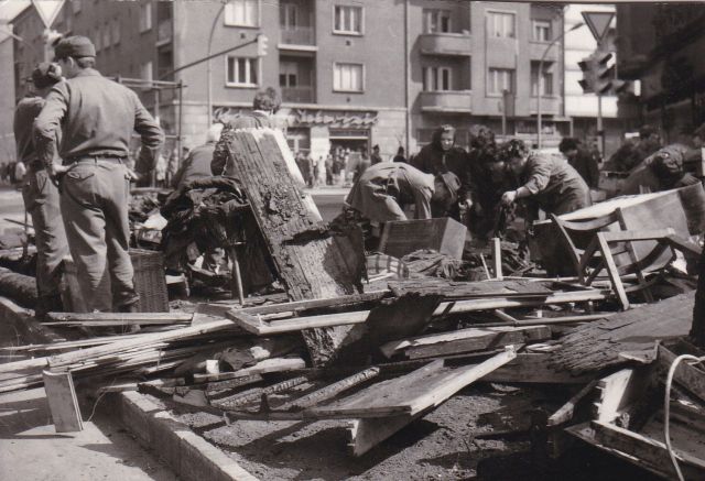 Miként bontás közben is egészen egyedi megoldásokat alkalmaztak. Például a hazánkban ideiglenesen állomásozó szovjet Vörös Hadsereg segítségét. Mert, ha jól látom a kép bal alsó sarkában lévő lánctalpas, tolólapos hadieszköz oldalára festett számokat, akkor ez egy orosz, katonai erőgép. Ami azt a feladatot kapta, hogy drótkötelek segítségével, darabonként húzza szét az épületet. Gondolom, a robbantást senki sem vállalta a város közepén, a téglánkénti visszabontás meg rengeteg időt és emberi munkát vett volna igénybe. A Vörös Hadsereg meg kéznél volt, talán pár üveg piáért is hajlandóak voltak egy kis – nem feltétlenül katonai – segítségre. Ráadásul a „múltat végképp eltörölni” sorok akár e munka közben is elhangozhattak.