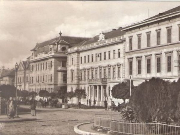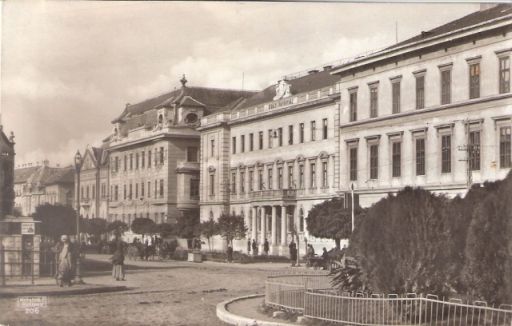 Egyébként, ha elindulunk a kép jobb oldala felől, akkor a bokrok mögött a mai Varga Katalin Gimnázium épületét látjuk, ami ekkor ugye még nem iskolaként, hanem a város postájaként funkcionált. Bejárata az épület Zagyva felé eső oldalán volt, emeletén pedig minden bizonnyal bérlakások lehettek. Mellette a már említett bíróság épülete, ami a XIX. század végén épült és 1924-ben kapott egy nem túl díszes második emeletet. Igaz, a tetőn körbefutó kőkorlátot és a „Királyi törvényház” feliratot meghagyták, sőt még egy díszes címerre is futotta a bővítéskor.