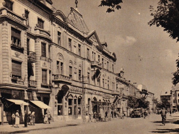 A magam részérül ugyanakkor az autók száma – ami nulla – alapján azt mondanám, hogy ez a felvétel inkább az ötvenes évek második feléről, mintsem a hatvanas évek elejéről való. Miután ugyanis 1958-tól már bárki vehetett személyautót, néhány év alatt Szolnokon is egyre több volt forgalomban, és tulajdonképpen azóta a város „korzójáról” autó nélküli kép nem is készíthető. Így talán nem tévedés azt állítani, hogy amikor az ismeretlen fotós a Ságvári Endre Művelődési Ház előtt, a mai zebra helyénél megállt, a Fodor Dániel által építtetett Nemzeti szálló éppen csak hatvanéves lehetett, miközben a mellette lévő – a kép bal szélén látható – Czinóber-ház sem sokkal lehetett több huszonötnél. Sajnos nem látszik, hogy ez utóbbi aljában milyen bolt működött a sarokhoz közeli helyiségben, viszont a bejáratnál egy női szabóság volt. A Nemzeti szálló földszintjén – ahol ma a bankfiókok működnek -, a fotóshoz közelebb egy Espresso, a világító felirattal megjelölt főbejáraton túl pedig éppen étterem működött.