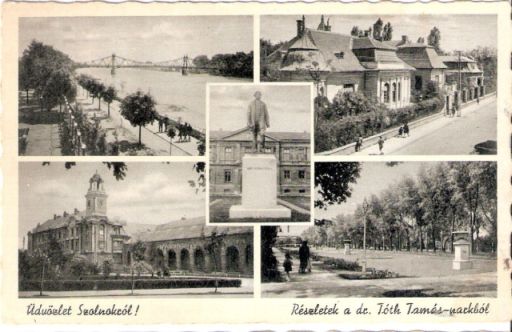 Ezen a képeslapon nem is a fotók a legérdekesebbek - bár van közöttük ritkaság -, hanem a jobb alsó sarokban lévő felirat, amely szerint a Dr. Tóth Tamás parkból láthatunk részleteket. Pár szót érdemes tehát arról is ejteni, hogy ki volt ez a mára elfelejtett névadó.