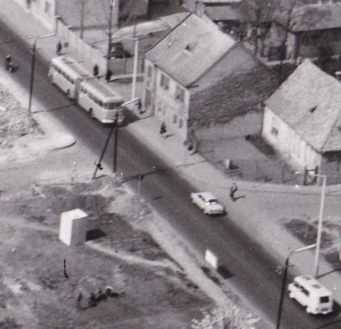 A Nagy Zsolttól kapott – és eddig itt közölt – szolnoki fotók alapján elmondhatjuk, hogy a megyei napilap egykori fotóriportere, sok más mellett, a hetvenes évek első felében, a gyors ütemben átépülő Szolnokot is rendszeresen megörökítette. Ennek köszönhető a mellékelt állókép is, amit a nagyításon lévő felirat szerint 1975-ben készített. Egyértelmű, hogy az akkor már álló, talán át is adott Vízügyi Székház nyugati oldaláról, szerintem a legfelső emeletről vagy a tetőről dolgozott, az árnyékok alapján valamikor dél körül. A rendkívül gyér autóforgalom miatt azt mondanám, hogy ez egy hétvégi munka lehetett, ugyanis 1975-ben azért ennél már nagyobb forgalomnak kellett lennie Szolnokon. Mindenesetre a vasút irányába haladó Nysa kisbusz és az előtte lévő S100-as Skoda mellett érdemes egy pillantást vetni a csuklós Ikarus 66-osra, amilyenek ekkoriban, szürke-fehér színkombinációban bonyolították a város tömegközlekedését.