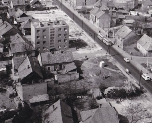 A kép előterében a ferencvárosi Pillangó, Jászkürt, Lovag és Kasza utcák számozás szerinti végeit látjuk. Ezen utcák közül már csak a Jászkürtöt érdemes keresni Szolnok térképén, a másik három az új városközpont kialakításával eltűnt. Nagyjából a mai Skála, a mögötte lévő parkoló, illetve a Szolnok Pláza helyét látjuk a felvétel bal oldalán, így nagyjából fogalmunk lehet arról, hogy a részben a 900 éves évfordulóhoz kapcsolódó szanálások milyen házakat és kerteket tüntettek el. A felvétel alsó részén megörökített épületek közül ma már csak a Jászkürt utcai társasház áll, aminek megszületése és léte e képet nézegetve még érdekesebb. Mikor, miért és kinek jutott eszébe, hogy ezt ide építse? Legalább annyira idegen lehetett új korában, mint mai környezetében.