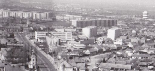 És ezzel át is térhetünk a felvétel felső harmadára, ami már leginkább a Cigányvárost mutatja. Ha jobbról, a Sarló utcától indulunk, láthatjuk, hogy ekkor még nem ért a Thököly útig a Csokonai házsora. Viszont a Thököly KISZ-házai már állnak, miként a pagodának is nevezett vasúti irányítótorony, a Mátyás király úti iskola és az utca négyemeletesei. Az a nagy folt pedig a néhai Ifjúsági Sporttelep – korábban MOVE vagy MTE pálya – aminek a helyén ma az Interspar és a parkolója található.