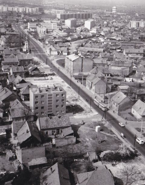 Nagy Zsolt, a megyei napilap egykori fotósa nem repülőn szállt 1975 körül az átépülő Szolnok fölé, hanem az akkor már majdnem átadott Vízügyi Székházból örökítette meg a mi Ferencvárosunk keleti szélét. Azaz a még gyér forgalmú, a Horánszky nyomvonalát részben már elhagyó Ady Endre utcát.