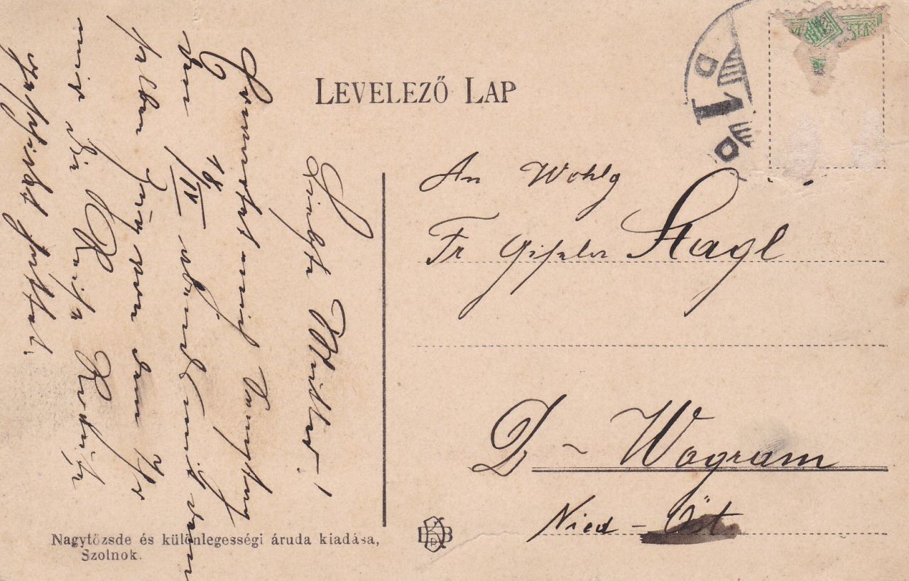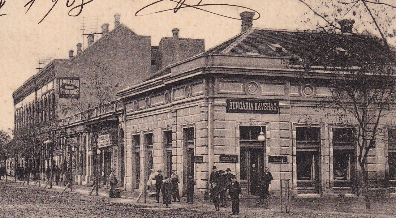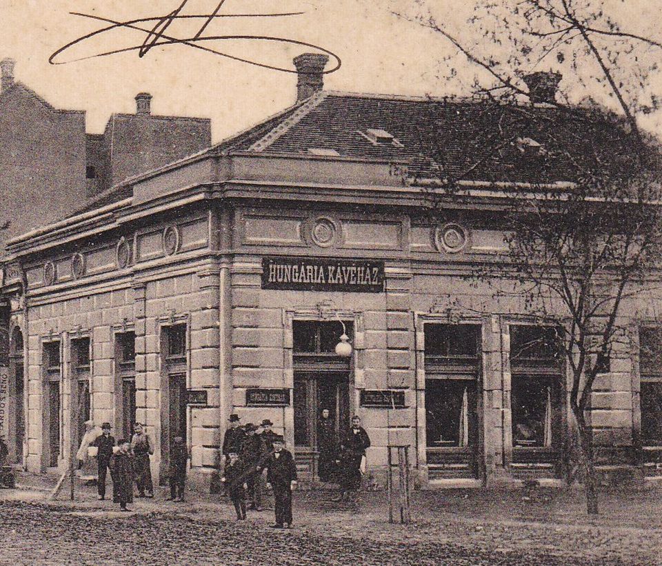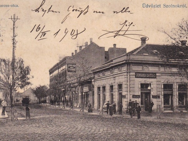 A fenti leírásból talán kiderül, hol állhatott ez a bizonyos Hungária kávéház, amiről az előző századforduló környékén a szolnoki „Nagytőzsde és különlegességi áruda” jelentette meg az itt bemutatandó képeslapot. Merthogy gyanítom, az anziksz finanszírozója a Szolnok legforgalmasabb kereszteződésében egykor található kávéház tulajdonosa vagy bérlője lehetett, hogy ilyen, akkoriban még újdonságnak számító módon reklámozza az üzletét. Talán a birtokomban lévő lapot is ott vásárolta meg ismeretlen postázója, hogy az alsó-ausztriai Wagramba küldje 1908. április 16-án. Azaz az Osztrák-Magyar Monarchia idején, amikor a rohamosan fejlődő Szolnok központjában több kávéház közül is választhattak a helyiek és a hatalmas birodalom különböző pontjairól leginkább vonattal érkező utazók.