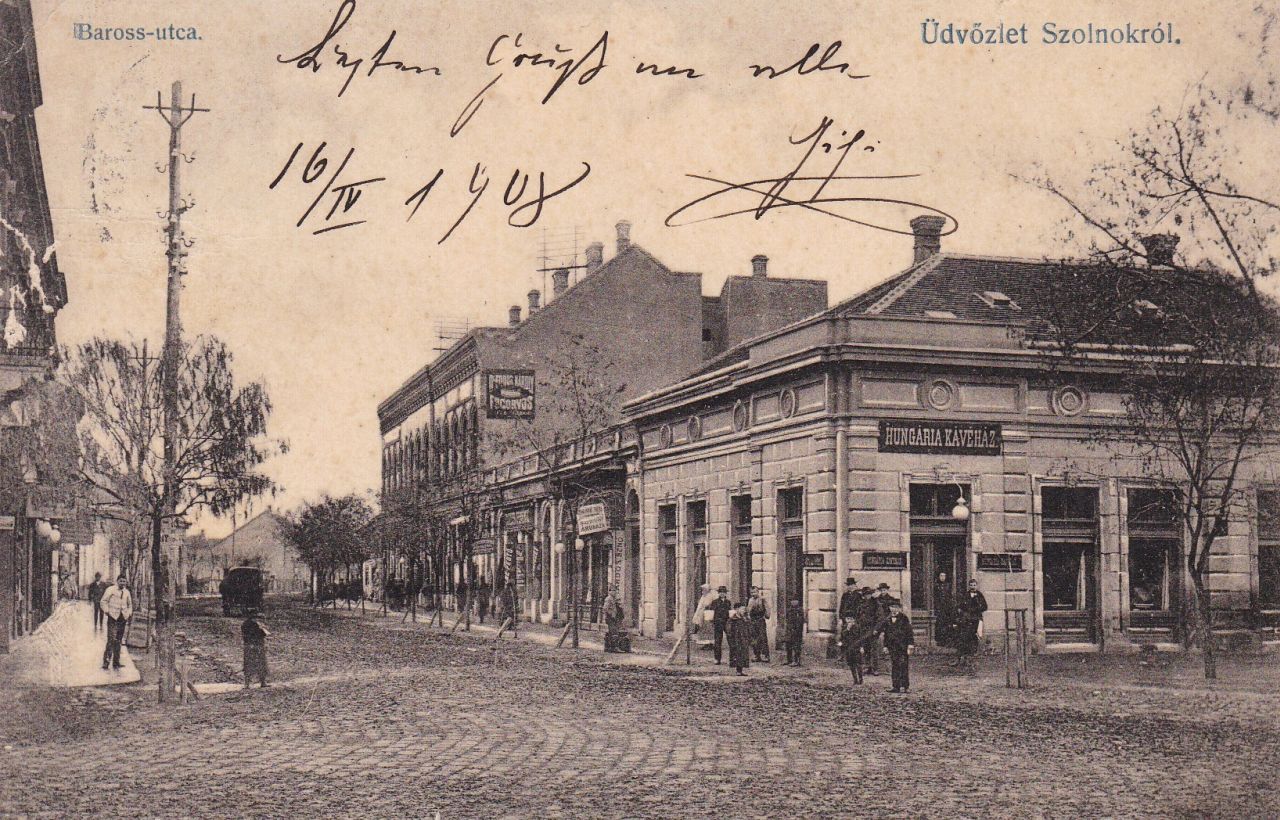 A néhai szolnoki Hungária kávéházba érkező reggeli lapokat és egyéb küldeményeket a Baross utca 1. szám alá kellett címezni. Bár úgy tűnik, a földig érő ablakos helynek inkább a Szapáry utcáról nyílt a bejárata. Igaz, a keleti oldalára ülők a Gorove utcán keresztül akár a Kossuth térig is elláthattak.
