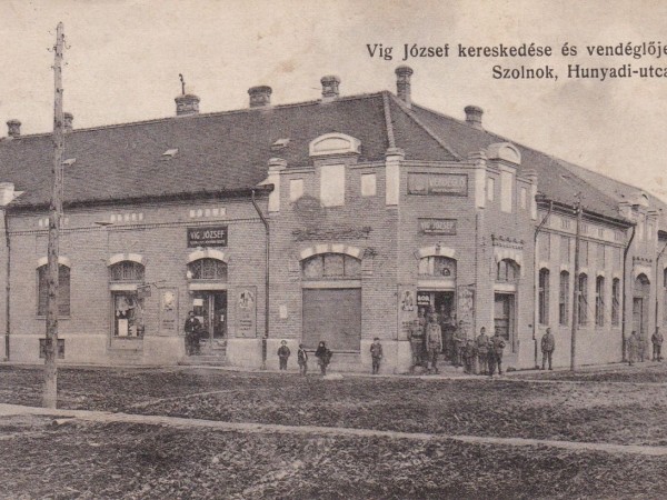 A sajnos kibogozhatatlan vezetéknevű Nagykárolyban élő feleségének küldte a birtokomban lévő képeslapot Jani (János) 1916. február 29-én (szökőnapon). A grafitceruzával írt anziksz sorai nehezen olvashatók, de az egyértelműnek tűnik, hogy Jani a 68-as gyalogezredhez érkezett Szolnokra, pár nappal a lap feladása előtt. Bár nem vagyok benne biztos, de mintha azt is megírta volna „szeretett, kedves feleségének”, hogy a képen látható helyen is megfordult, talán ott kaptak enni. Ami nem lenne meglepő, hiszen a Hunyadi vendéglő és Víg József kereskedése van a fotón. Így a magam részéről abban is biztos vagyok, hogy a partiumi baka Víg úr üzletében vette ezt a lapot, ami tulajdonképpen Víg József vállalkozásainak reklámkiadványa is volt egyben. A fővárosi Fénynyomda és Grafikai Műintézetben készített képeslap hátoldalának további érdekessége, hogy nem egy sima 5 filléres bélyeget ragasztott rá a friss katona, hanem olyan felülnyomottat, aminek árából 2 fillért hadi segélyként – kvázi adóként beszedve – özvegyek és árvák kaptak meg. Ami nem csoda az első nagy háború második évében. De kicsit morbid, ha belegondolunk, hogy tulajdonképpen ilyen bélyegekkel levelezhettek azok a leendő háborús áldozatok, akik után támogatandó özvegyek és árvák maradtak hátra.