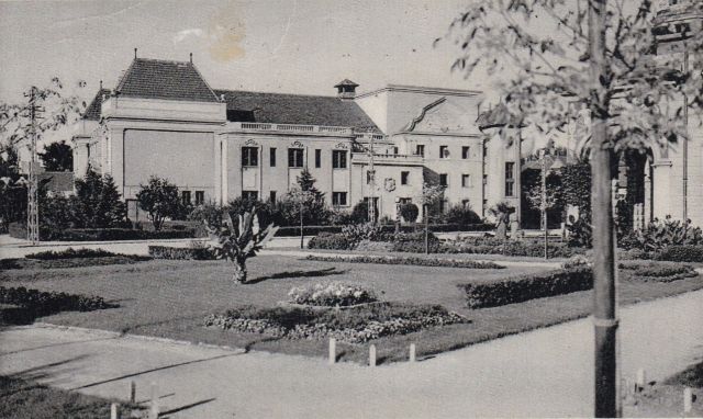 Monostoryék felvételének középpontjában azonban inkább a szolnoki Városi Színház épülete látható. Nem véletlenül. A tér névadójának, Horthy Szabolcsnak a főispánsága idején, 1912-ben épített teátrum ugyanis az első világháborút követő Tanácsköztársaság alatt súlyos károkat szenvedett, és csak a húszas évek második felére sikerült felújítani. Bár állandó társulata még közel harminc évig nem volt az épületnek, a második átépítése – ami főleg a főhomlokzatot érintette – kifejezetten szépre sikerült. A legérdekesebb része az oldalsó szárny közepén, az egyemeletes rész ablakai között látható címer. Sajnos nem vehető ki, pontosan melyik, így csak feltételezem, hogy a felújításért komoly áldozatokat hozó Szolnok korabeli címerét helyezték a teátrum falára. Aminek főbejárata egyébként akkoriban a gróf Apponyi Albert utcára nyílt.