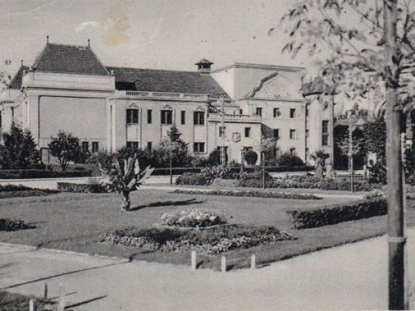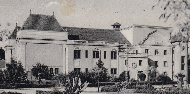 Monostoryék felvételének középpontjában azonban inkább a szolnoki Városi Színház épülete látható. Nem véletlenül. A tér névadójának, Horthy Szabolcsnak a főispánsága idején, 1912-ben épített teátrum ugyanis az első világháborút követő Tanácsköztársaság alatt súlyos károkat szenvedett, és csak a húszas évek második felére sikerült felújítani. Bár állandó társulata még közel harminc évig nem volt az épületnek, a második átépítése – ami főleg a főhomlokzatot érintette – kifejezetten szépre sikerült. A legérdekesebb része az oldalsó szárny közepén, az egyemeletes rész ablakai között látható címer. Sajnos nem vehető ki, pontosan melyik, így csak feltételezem, hogy a felújításért komoly áldozatokat hozó Szolnok korabeli címerét helyezték a teátrum falára. Aminek főbejárata egyébként akkoriban a gróf Apponyi Albert utcára nyílt.