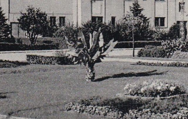 A felhasznált fotó előterében a mai Tisza park sarka látható, az a kis terület, ahol 2001 óta Pogány Gábor Benő Zounuk ispánt mintázó, szökőkútra helyezett szobra áll. A szolnoki közterületi szobrok szempontjából az elmúlt száz év talán legérdekesebb helye ez. Zounuk előtt bő évtizeddel ugyanis még Kocsis András Lenin-szobra (1966-1990) állt itt. Ahol ugyancsak tíz évvel korábban még az a bizonyos hét méter magas obeliszk – „szivar” – volt látható, amelyet már 1945. május 1-jén felállítottak a „felszabadítók tiszteletére”, de 1956 októberében a szolnokiak ledöntöttek. A „szivar” előtt pedig – ha nem is pontosan a helyén, hanem ebből a szögből nézve attól kicsit balra – közel egy évtizeden át egy a Trianonra és az ország megcsonkítására emlékeztető virágágyást találhattak az arra járók. Azaz, amióta kialakult ez a kis „terecske”, minden rendszer elhelyezte itt a maga „emlékművét”. Amiknek a helyén legelőször – minden bizonnyal nem sokkal a terület parkosítása után – egy törpe pálmafa növögetett.