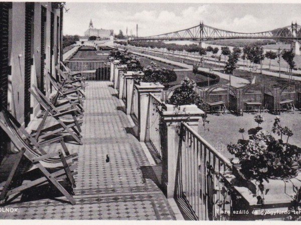 A Hegedűs Ármin által tervezett és a szolnoki építési vállalkozó, Bedő Antal által épített szálloda legjobb szobáihoz tartozó teraszt mutató képeslapot nézegetve, nem tudok szabadulni a gondolattól, hogy vajon mit lehetett például 1930-ban Szolnokon turistaként csinálni. Az addig rendben van, hogy meg lehetett mártózni a Tisza szálló gyógyfürdőjében, esetleg úszni lehetett a Tiszában a túlparton lévő strandok valamelyikénél, sőt akár csónakázni is lehetett a folyón, meg mindezek után egy jót enni a város legjobb éttermében és este táncolni a kerthelyiségben. Hány nap után lehetett erre ráunni? Mert ne felejtsük el, hogy 1930-ban még nincs hangosfilm, azaz mozi Szolnokon. A szállóval szemben lévő színházba átutazó társulatok szórakoztatták alkalmanként a közönséget. A Művésztelepre lehetett kilátogatni, mert nem volt múzeum sem. Legfeljebb a főtéri piac, esetleg az Alföld látványa lehetett némi program.