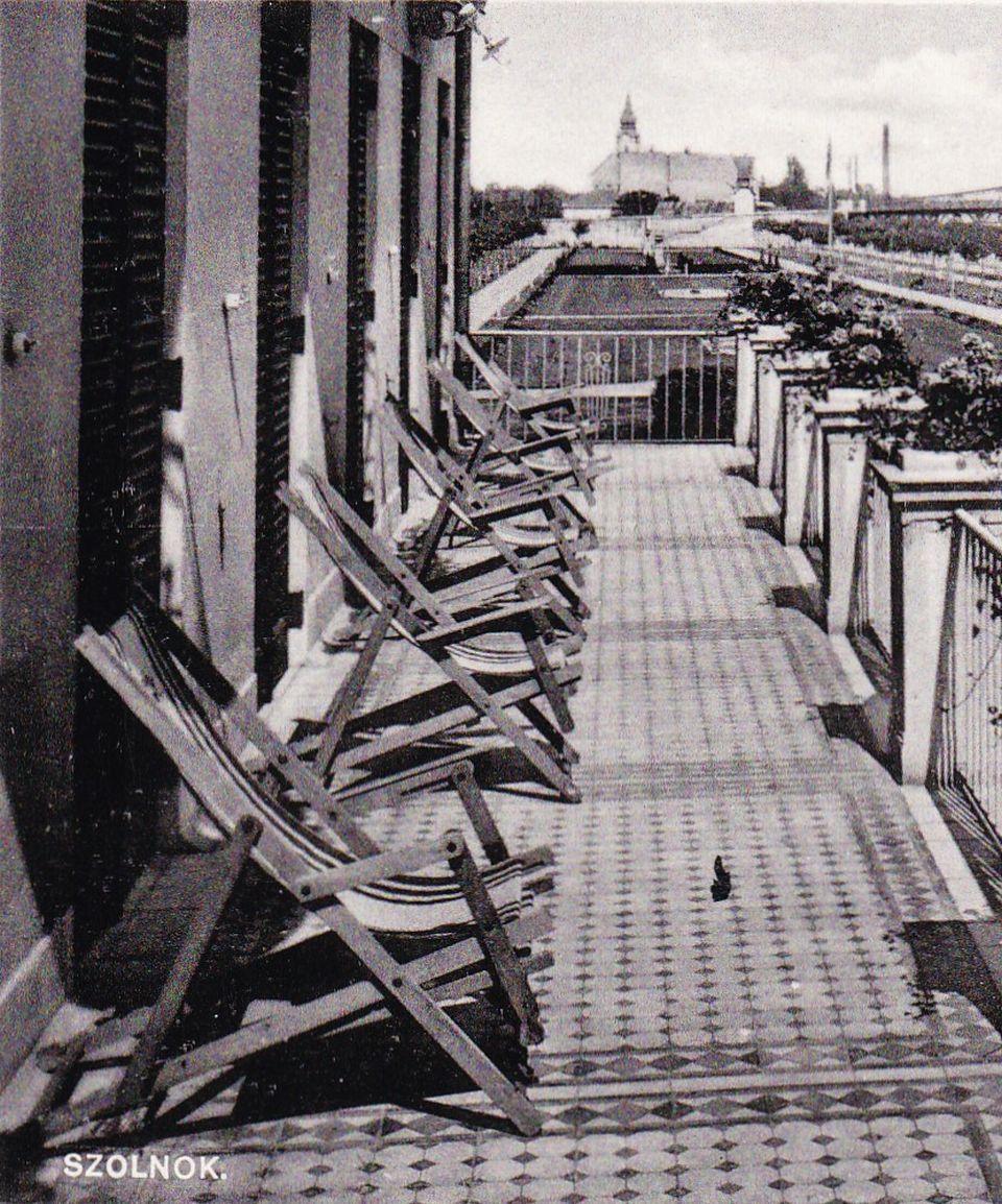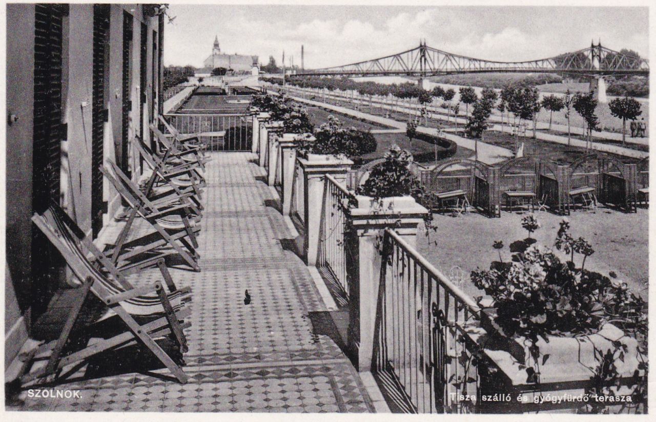 Tiszára néző szoba. Déli tájolású terasz napozóágyakkal. A forróság ellen zsalugáteres ajtók, amin keresztül a nyári estéken beszűrődhet a kerthelyiségben játszó zenekar muzsikája, az összecsörrenő tányérok és a vidám vendégek zaja. Szolnoki idill 1930-ból, a Tisza szállóból, Nerfeldék képeslapján.