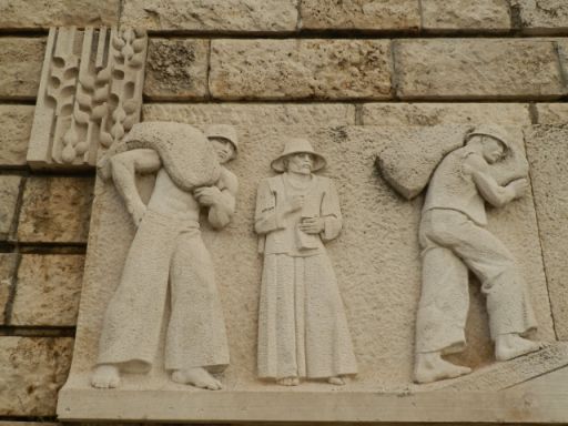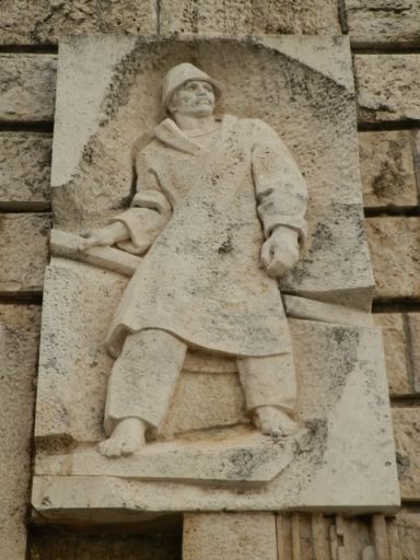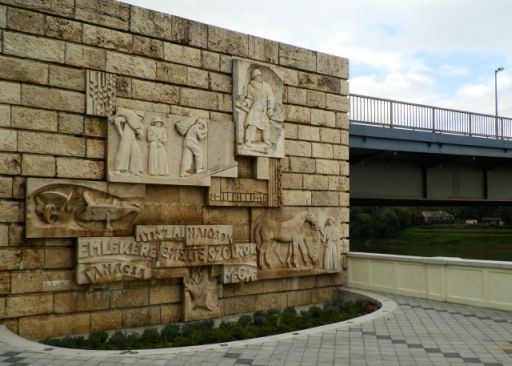 A Jubileum téri Tanúheggyel együtt a Tiszai hajósok emlékműve a hetvenes évek Szolnokának, a 900 éves évfordulóra átépülő városnak emblematikus köztéri, képzőművészeti alkotása. Őszintén megmondom, a fehér kőből faragott domborművek miatt azt hittem, nemcsak időben és stílusban mutatnak rokonságot, hanem esetleg az alkotó, alkotók személyében is. Ez utóbbi persze tévedés, hiszen amíg a Tisza-híd lábánál lévő, nyolc önálló képből a feliratból álló alkotás Lajos József munkája, addig a vasútállomásnál látható, kilenc tömbből felépített Gyurcsek Ferenc és Kampis Miklós műve.