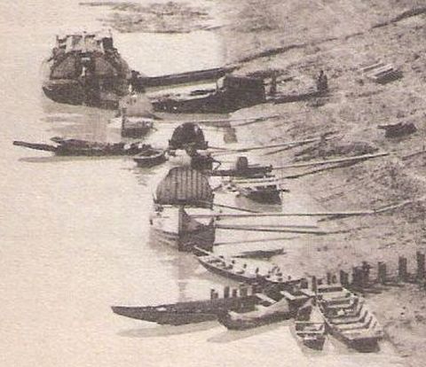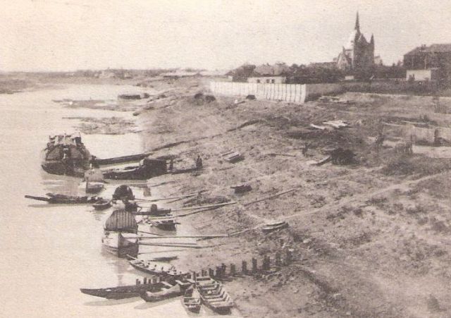 A kép közepén, a folyón látható hajókra is érdemes pár pillantást vetni. A legnagyobb egy igazi bőgős hajó, amik az elején és a végén lévő, a nagybőgő nyakára emlékeztető csavart díszről kapták a nevüket, és leginkább ömlesztett áru, főleg gabona szállítására szolgáltak. Kicsivel előtte egy kisebb merülésű, széles testű hajó, ami a folyó menti települések közötti áruszállítást szolgálhatta. Körülöttük pedig számtalan ladik, amelyeket leginkább a tiszai halászok használhattak. Hogy éppen itt vannak kikötve, az nem véletlen, és nem is amiatt van így, mert akkoriban lényegében a torkolattól a nagykanyarig hajók ringtak a folyón – hisz a Tiszán valódi élet volt -, hanem mert a mai Verseghy-park és Rózsakert környéke számtalan piacnak adott akkoriban helyet. Itt volt például a gabonapiac, a csirke- és disznópiac, de a halat is az akkor már álló Megyeháza környékén, és nem a Városháza előtti Kossuth téren árulták.