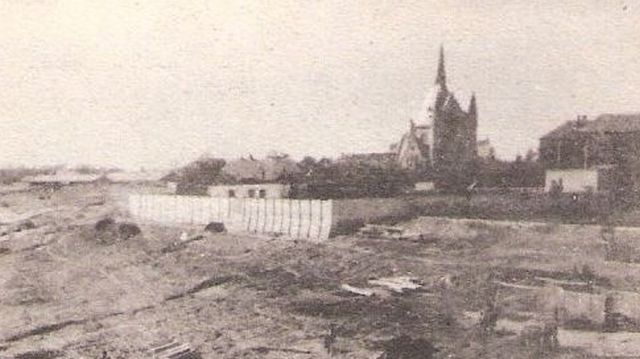 Arra persze nagyon kíváncsi lennék, hogy mi az legalább kétméteres fal vagy kerítés, ami a gimnázium előtti mai park területét veszi körül. És mikor építették? Az ugyanis biztos, hogy mögötte ekkor már majdnem két évtizede létezett az a parkosított terület, ami a gimnázium elől, félkörívbe vezette a Tószeg felől a hídhoz tartó utat. Elképzelhető, hogy nagyjából a mai Táncsics és Magyar utcák vonalában már egy valamennyire feltöltött terület volt ekkor? Ami aztán mintául szolgált a képen látható, korabeli „barnazóna” felszámolásához.