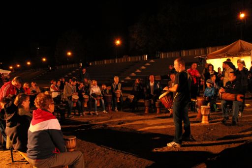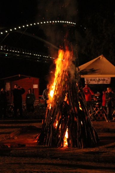 Az este meg egészen varázslatos volt. Persze kár, hogy fél nyolc körül üdítőt már nehezen lehetett szerezni, a kenyér lángosos meg a kürtőskalácsos is utolsó erejével próbált kiszolgálni, az áruspultok meg üresek voltak. Ám a tűzgyújtás előtti közös dobolás mindezt megbocsáthatóvá tette. Szerintem zseniális ötlet volt legalább negyven hangszert kivinni a partra, és arra kérni a tűzgyújtásra várókat, hogy körbe ülve vegyenek egyet-egyet maguk elé. A kör közepére beálló avatott dobos – sajnos a nevét nem jegyeztem fel -, rövid idő alatt megzabolázta a dörömbölés lehetőségétől megrészegedőket, és negyedóra alatt egy egész komoly ütős együttest varázsolt az amatőrökből. A közös zenélés után fellobbantott máglya meggyújtása pedig feltette az egészre a koronát.