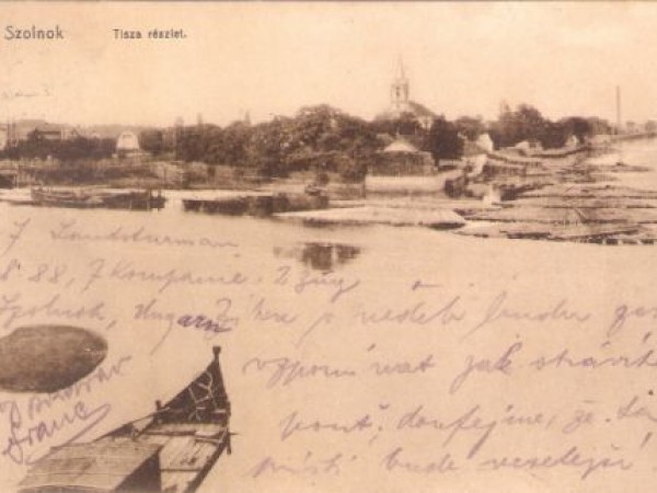 Feltételezem azonban, hogy a képeslapnak ezt a példányát csak valamikor az első világháború idején adhatták postára, mégpedig egy cseh vagy szlovák anyanyelvű, Szolnokon áthaladó vagy itt állomásozó Monarchiabeli katona. Sajnos a bélyeget és a bélyegzőt barbár módon eltávolították a lapról, és a feladó sem tartotta fontosnak a dátumozást, ám a kisilabizálható szöveg, illetve a katonai hadtestre vonatkozó számozás az 1914-18 közötti postázást valószínűsíti. Ami nem is lenne meglepő, hiszen számtalan, a múlt század elejéről származó, Szolnokot ábrázoló képeslap azért maradhatott fenn, és kerül elő távoli helyekről, mert a várost valamiért érintő katonáknak ez volt az egyetlen lehetősége, hogy hírt adjanak magukról a nagy háborúban.