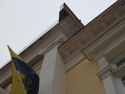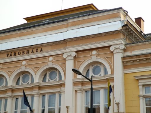 Valamikor decemberben hosszasan fel volt állványozva a Városháza főhomlokzata. Akkor azt gondoltam, hogy a 130 éves épület további csinosítását végzik. Jó pár hete eltűnt az állvány, és eddig azért nem írtam a munka eredményéről, mert azt reméltem, ideiglenes megoldás született, amit hamarosan eltávolítanak. Mivel azonban bő hónapja a helyén van a díszterem ablakai és tetőzet közötti bádog förmedvény, kénytelen vagyok szóvá tenni a dolgot.