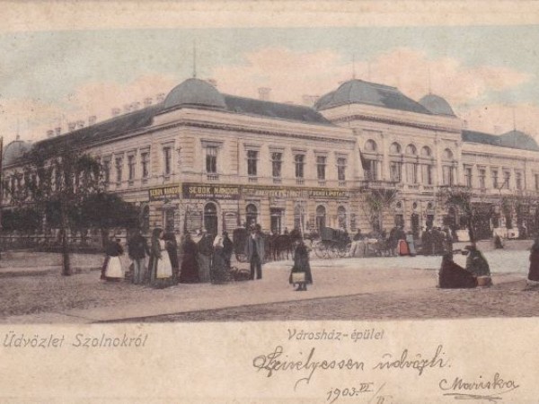 Az itt bemutatott festett lap további különlegessége számomra, hogy olyan, mintha egy akvarell lenne. Ha nem ismernék egy korábbi fotót, akár azt is elhihetném, hogy a postázás idején már létezett Szolnoki Művésztelep valamelyik festője tett szert ezzel a munkával egy kis mellékesre. Különösen az előtérben lévő alakok elnagyoltak, szinte arctalanok. Miközben a városháza kontúrjai, színei egész szépen kidolgozottak. És, ami még érdekesebbé teszi ezt a lapot, az a két oldalának különállósága: azaz a képes és a címzéses oldalt külön papírokra nyomták, majd a kettőt összeragasztották. Soha sem találkoztam még ilyen megoldással. Talán ennek is köszönhető, hogy a már az előző századfordulón bevett gyakorlattal szemben a két oldal tulajdonképpen fejjel lefelé van egymásnak.