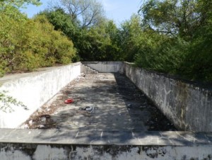 Csak tippelem, hogy ennek köszönhette létét a TVM lakótelep és a gát közé épített egykori vegyi strand is. Aminek a pusztulását szintén az egykori szocialista ipar leépítése idézte elő. Így ma már csak nyomokban és romokban fedezhető fel a strand. Ahol a bozótosba járkálva nekem ma úgy tűnik, hogy egykor lehetett egy nagymedence – ami lényegében egybe volt építve egy kisebbel -, illetve távolabb egy gyerekpancsoló alapjait is fel lehet fedezni. Ezeken kívül csempézett zuhanyzó és talán az öltözők, meg a régi bejárat nyomait lehet megtalálni. Nem mondanám, hogy biztonságos és felemelő látvány az egykori vegyi strandon nézelődni, de azért mutat valamit a régi képéből.