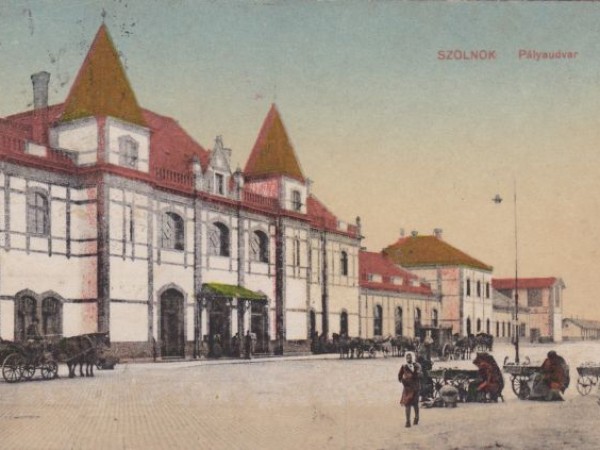 Szolnok harmadik vasútállomás épületéről viszonylag sok képeslap maradt fenn. A gyűjteményemben azonban ez az első, amelyik az épülettől jobbra, tehát a mai posta irányában lévő részeket is megmutatja. Az árusok, a delizsánsz és a félbemaradt festés miatt is érdekes ez a kép.