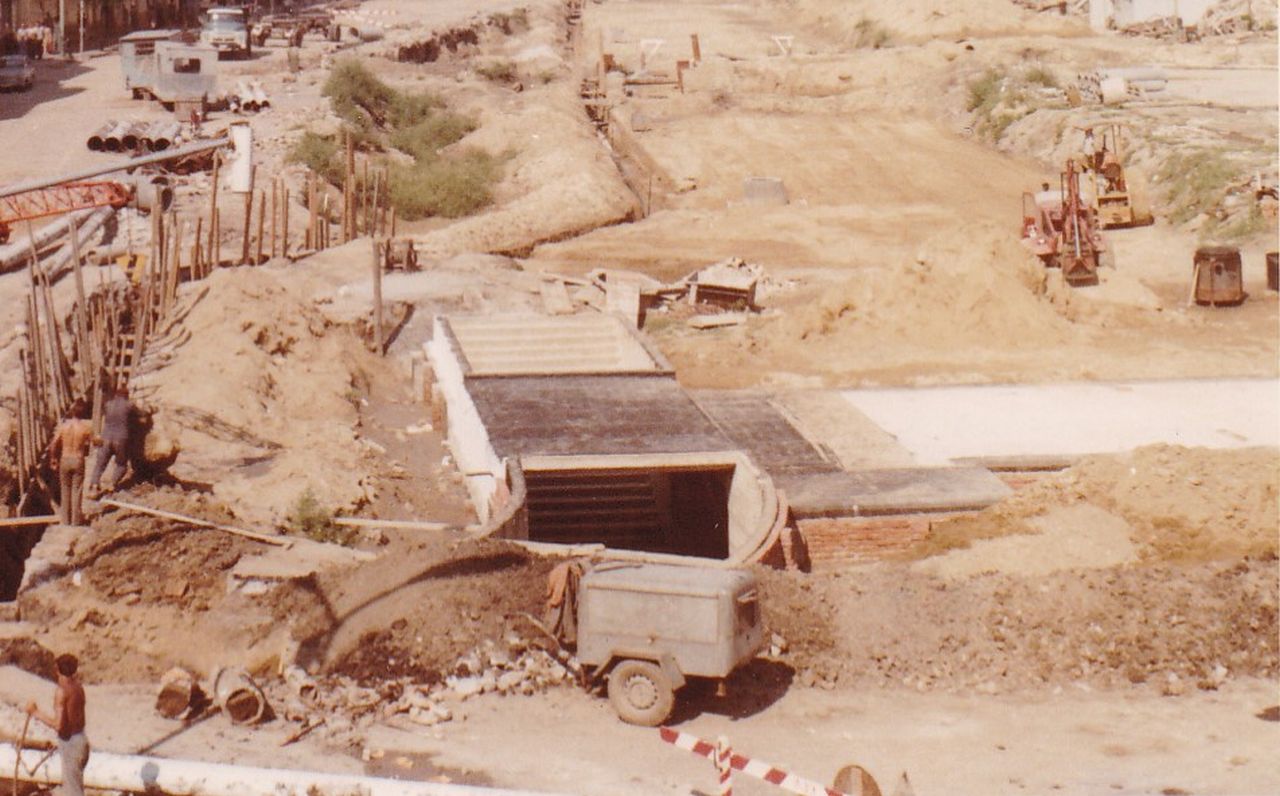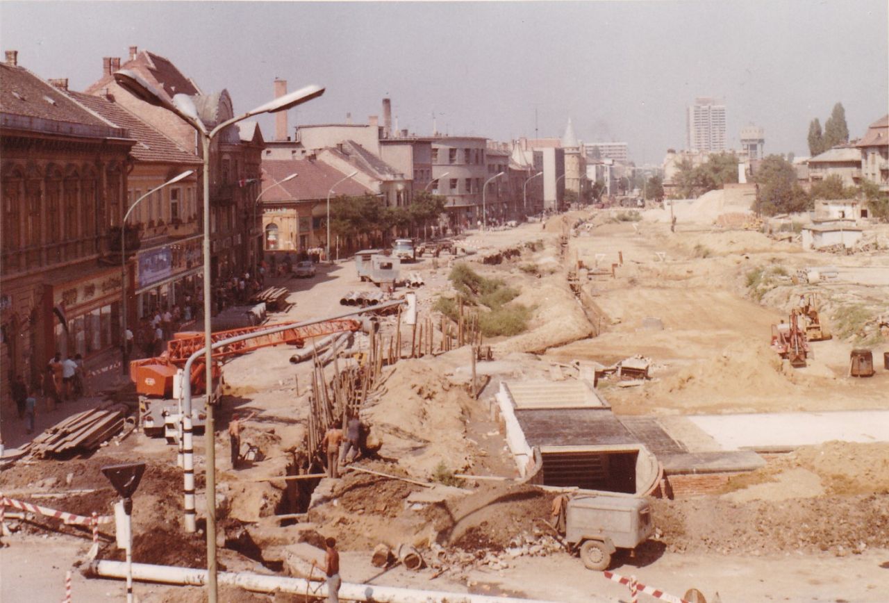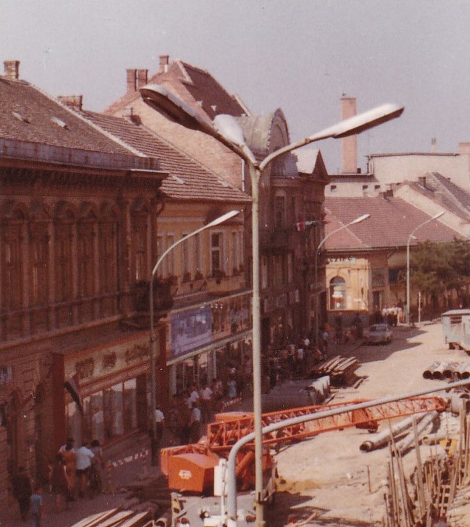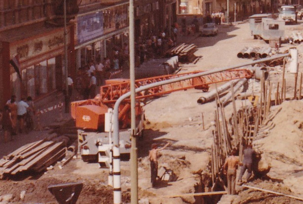 Nézzük meg rajta először az építési területet! Azaz a Baross utca néhai páratlan oldalát, amit a mai Szapáry utcától – akkor Ságvári körút – kezdődően a hatvanas évek elejétől kezdtek szisztematikusan szanálni a Hősök teréig. A kereszteződésben lévő Hungária kávéház talán még a második világháborúban semmisült meg, majd következett a Kossuth utca végéhez tartozó Kereskedelmi Bank és a mellette lévő temetkezési vállalat elbontása, hogy helyet csináljanak a Ságvári körúttá válásának és a pártháznak. Aztán a Hősök tere sarkán lévő bolt következett még a hatvanas évek első felében, hogy aztán a hetvenes évek elején a Kommunisták Magyarországi Pártjának alakulási helye, a Tiszavirág presszó épülete, a 33-asnak helyet biztosító Madas-ház és a Beloiannisz és a Szív utca közötti rész is eltűnjön. Pont addigra, amikorra a József Attilán és a Beloiannisz felsőbb részén befejeződött a közművek cseréje – miként a Kossuth téren is -, így nekiugorhattak a legnagyobb falatnak a Ságvári körút és a Hősök tere között. A mellékelt fotón még fektetik a közműveket, de már készül az aluljáró, és az utca, egyben a 4-es főút átkelési szakaszának az új nyomvonala is ki van jelölve.