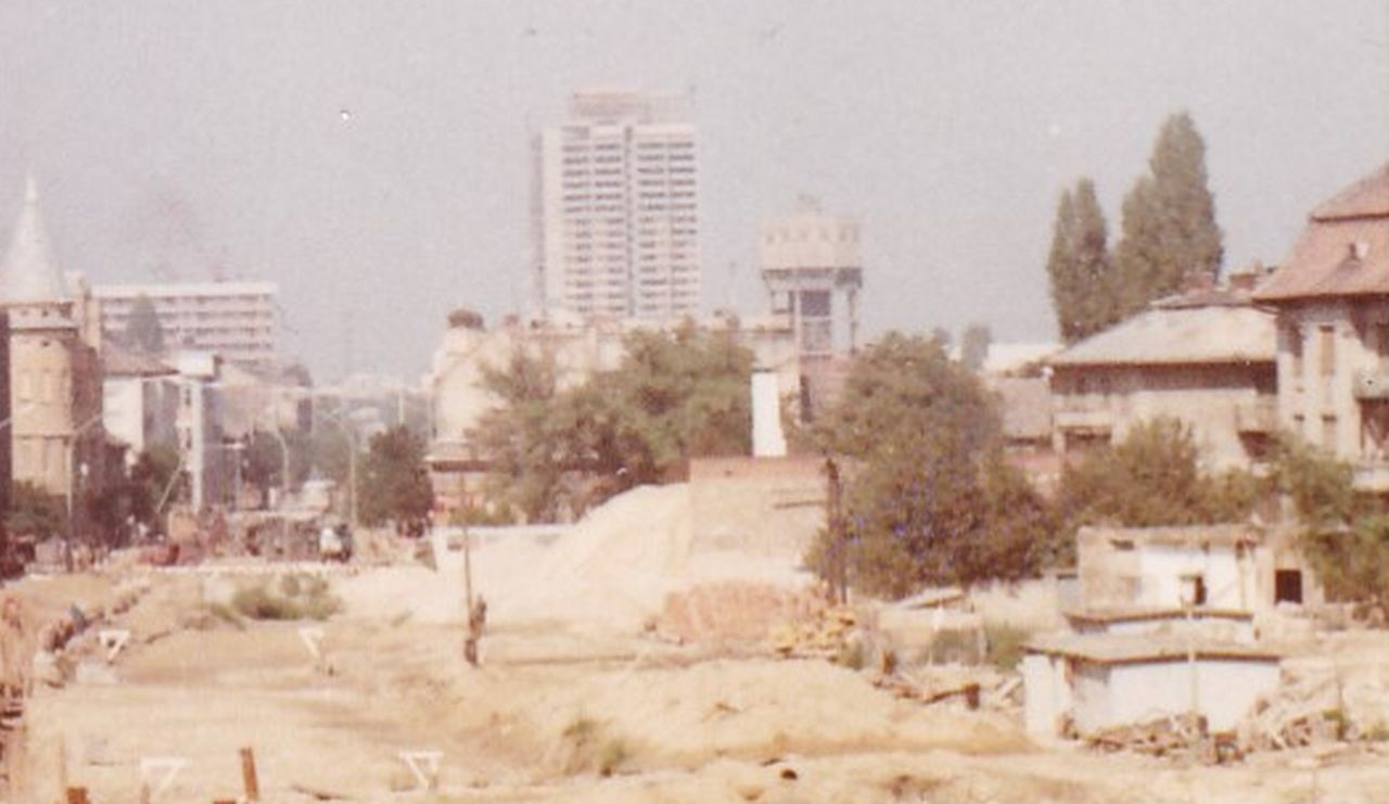 Az egykori Nerfeld-palota második emeletéről profi fotós készíthette ezt a felvételt 1974-ben a mai Baross utca elejéről, amikor az még Beloiannisz út volt. Valószínű, hogy az ismeretlen fotós nem turisztikai emléknek szánta a felvételt, hanem a 4-es út építéséről szóló képes beszámolónak.